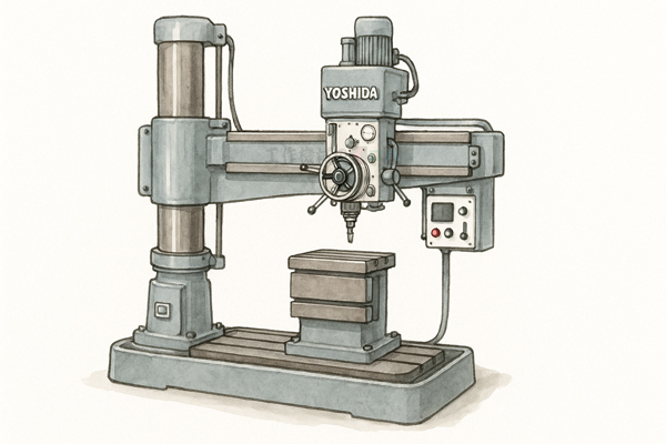 主軸がアーム上を前後左右に移動でき、大型ワークに対して位置を合わせやすい構造のボール盤です。ワークを動かさずに穴位置を調整できるため、大径ワークの加工に強みがあります。