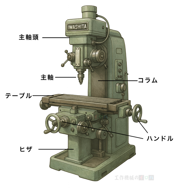 フライス盤はシンプルな構造に見えますが、加工精度・剛性・生産性を左右する重要な構成要素が多数あります。ここでは主な部品の役割と、機種選びで注意すべきポイントを現場目線で解説します。